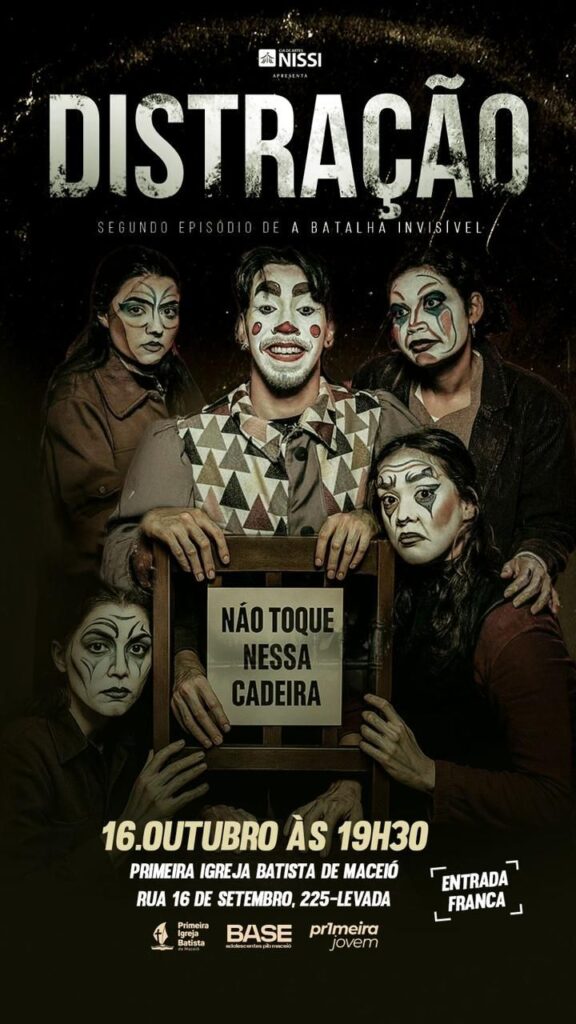Teremos uma peça impactante com com a Cia Nissi: DISTRAÇÃO!Mais que uma peça… é *um alerta para os nossos dias!*👉 Entrada gratuita!Aberta para toda a Igreja e todas as idades.Convide seus familiares e amigos! 🙌